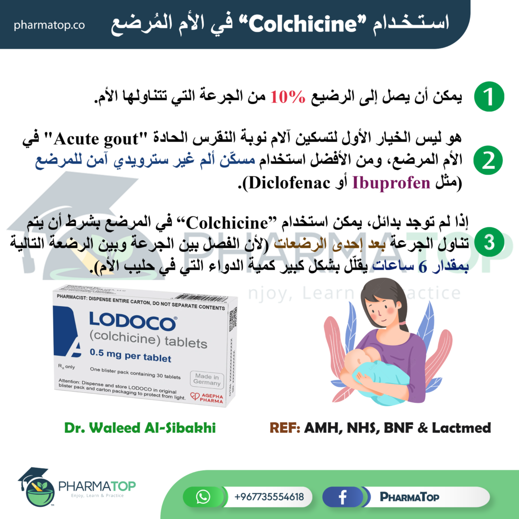 نوبات النقرس الحادّة تصيب مختلف الأعمار، ولذلك قد تصيب امرأة مرضع .. وهنا يبرز السؤال حول استخدام هذا الدواء واحتمالية أن يسبب ضرراً للطفل الرضيع colchicineأدوية المرضع Share this post An Important Note about “Timolol Gel” Why Should We Avoid “Pseudoephedrine” During Pregnancy & Breastfeeding ?? Related PostsWhy Do We Consider “Latanoprost” Safe for Breastfeeding Women ??18/11/2024Codeine is NOT Safe in Breastfeeding Women21/10/2024How to Use “Warfarin” Safely in Lactating Women ??28/04/2024